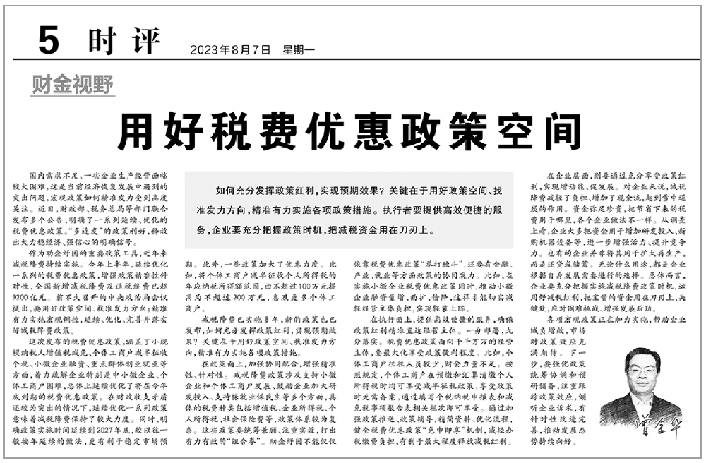 我在工作中经常与基层税务人员、企业经营者打交道,他们都很期待能够读到兼具权威性和可读性的政策解读文章,而《中国税务》这些文章较好契合了社会的广泛需求。税收宣传越深入、有效,纳税人的税法遵从度就会更高、依法纳税荣誉感就会更强,改革政策红利也会得到更好释放。