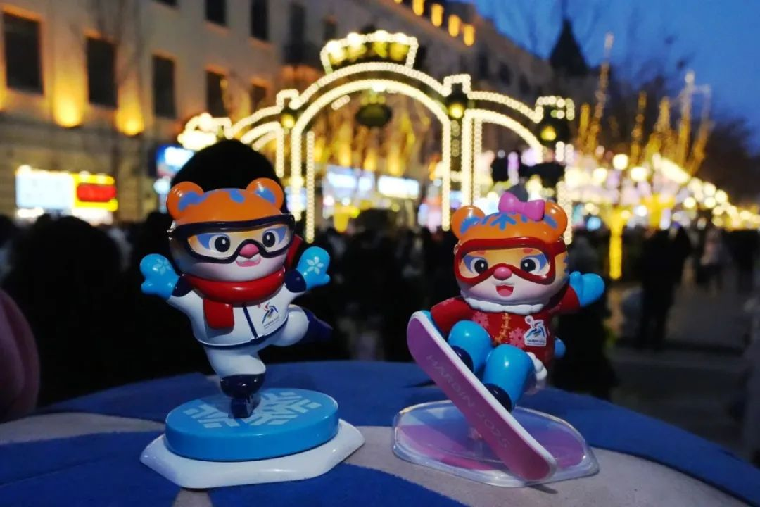 在哈尔滨的大街小巷,以东北虎为原型设计的亚冬会吉祥物“滨滨”和“妮妮”盲盒手办,化身二人转款、东北大花袄款、共和国长子款,吸引游客争相购买。其中,最具特色的一款是“铝镁侠”,由设计团队与东北轻合金有限责任公司合作,利用废旧铝材熔炼而成,体现了亚冬会绿色、环保的理念。