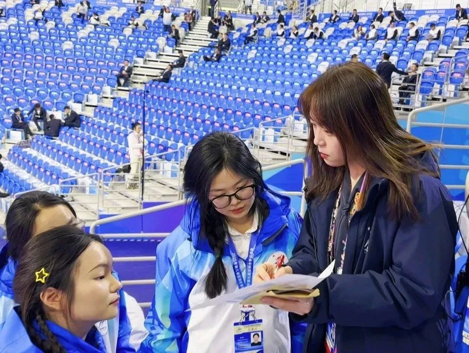 2月7日,在哈尔滨第九届亚洲冬季运动会开幕式国际贵宾入场前,黑龙江省税务系统志愿者与工作人员沟通对接。王妍 摄