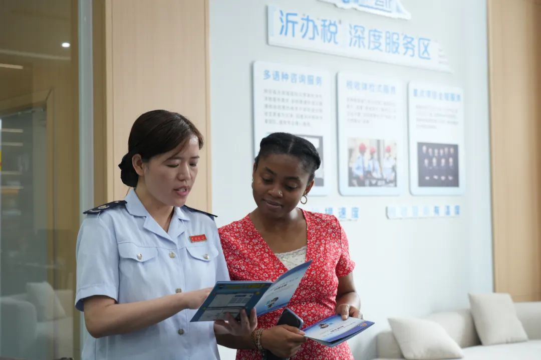 国家税务总局临沂市兰山区税务局在办税服务厅设立“深度服务区”,为前来办理涉税业务的外国人纳税人提供多语种的涉税咨询辅导。图为税务干部近日为一名外国人讲解我国的税收政策。郭勇 乔良 摄