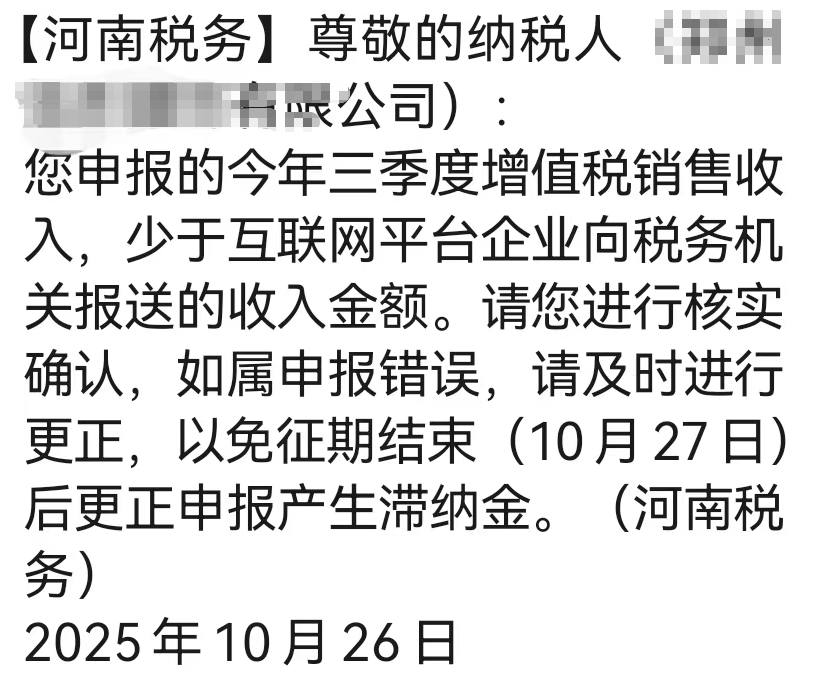 “【XX税务】:您申报的今年三季度增值税销售收入,少于互联网平台企业向税务机关报送的收入金额。请您进行核实确认,如属申报错误,请及时进行更正,以免征期结束(10月27日)后更正申报产生滞纳金......”