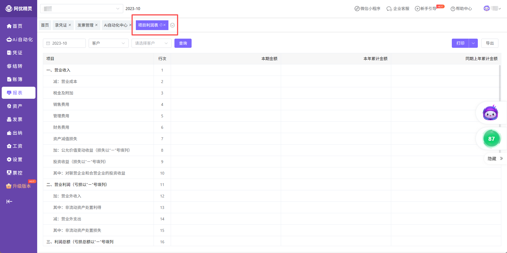 阿优精灵不仅仅是记账,更能自动生成 “项目利润表”。