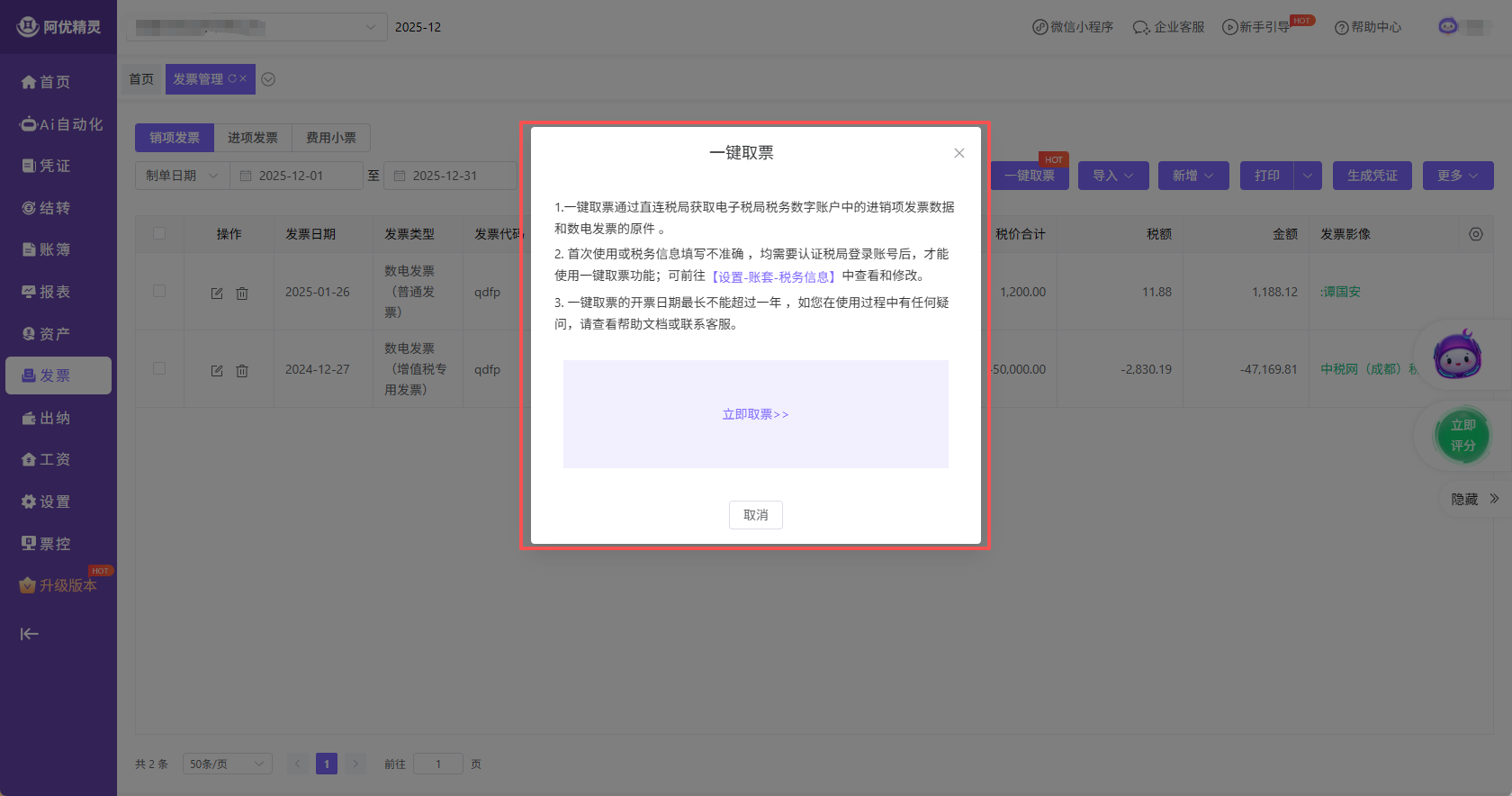 - 操作便捷:只需在【设置-账套-税务信息】中完善信息,点击“立即取票”,系统即可自动在后台完成数据抓取与同步。