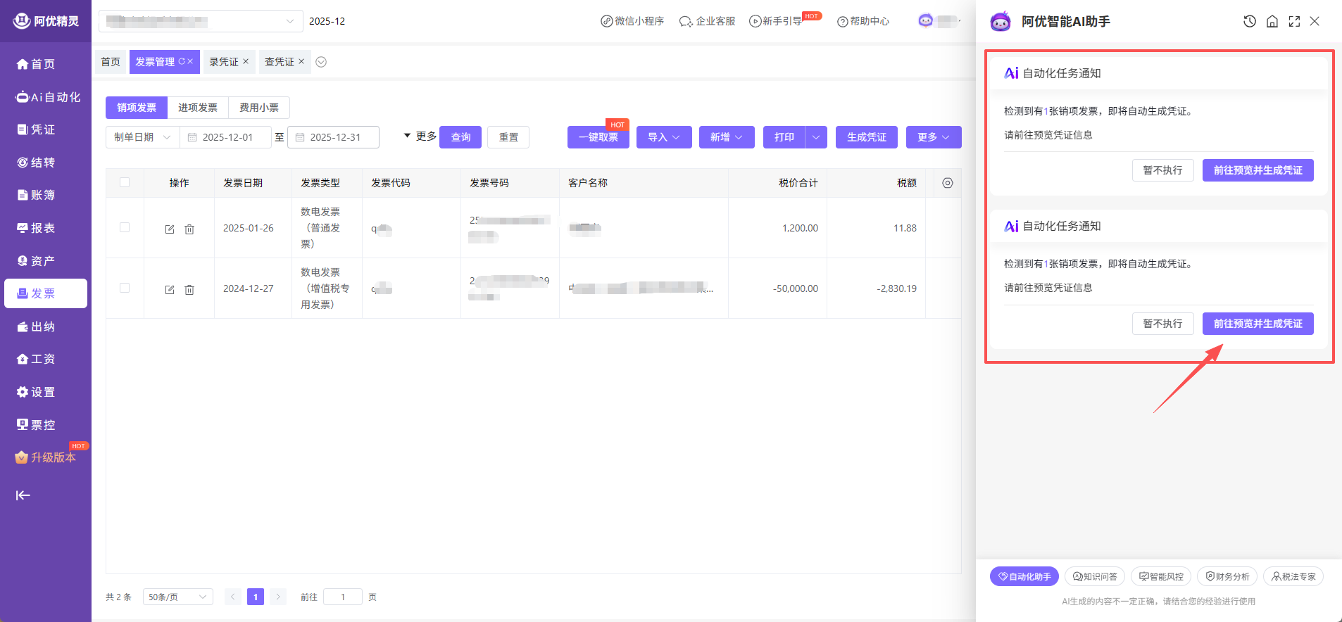 - 智能任务生成:当开启自动化任务开关(在【AI自动化-发票记账自动化】中设置)后,AI智能助手会自动监测新发票,并同步生成凭证任务。系统利用OCR与NLP技术,自动识别发票金额、税号等关键信息。