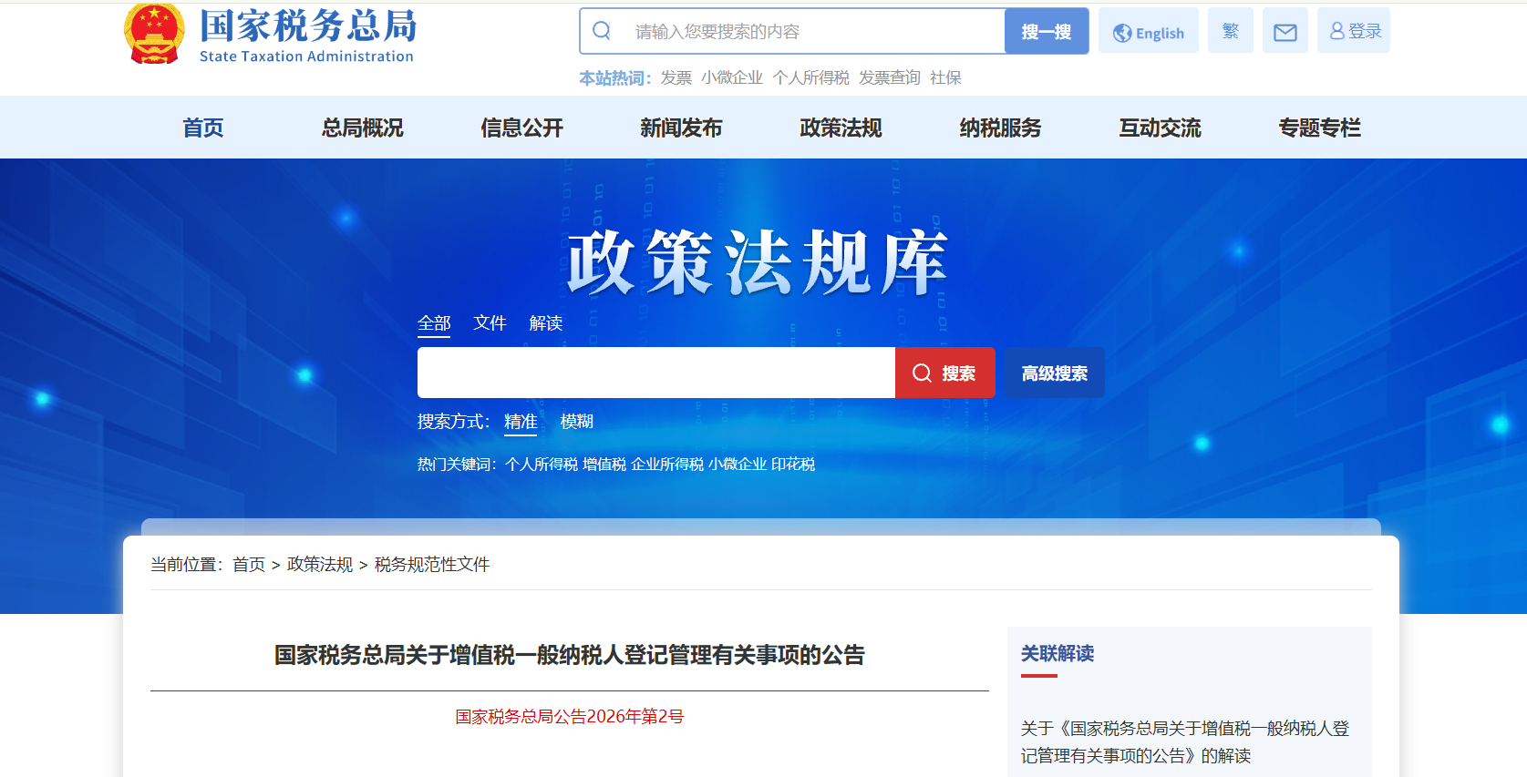 为落实《中华人民共和国增值税法》(以下简称增值税法)和《中华人民共和国增值税法实施条例》(以下简称实施条例)的要求,实行一般纳税人登记管理,税务总局配套制发了《国家税务总局关于增值税一般纳税人登记管理有关事项的公告》(2026年第2号,以下简称《公告》),就一般纳税人登记有关征管事项进一步予以明确。